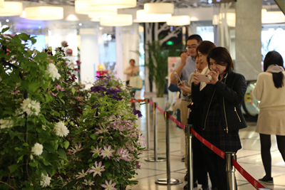 本次在“花漾徐家汇”各个景点相关展示区域、各大商场和科学普及活动区域,还示范展示了上海植物园近年通过引种筛选出的适应性和观赏性优良、适应上海地区栽培观赏的、近来国内流行观赏的新优园艺植物花卉,诸如藤本皇后铁线莲(爱丁堡公爵夫人、肖邦、奥贝雷克舞、东方晨曲等品种)、耐阴植物之王玉簪、湿生植物路易斯安娜鸢尾、杜鹃花新品及特色藤本植物等等不同品种,以及近年在各届上海国际花展上广泛进行示范展示应用的主题花天竺葵、大丽花、朱顶红等。 其中在美罗城同步举办的2019上海国际花展 铁线莲精品展共展出各类新优品种30余个配以观叶植物玉簪,将商场一楼营造出典雅及梦幻的色彩氛围。
