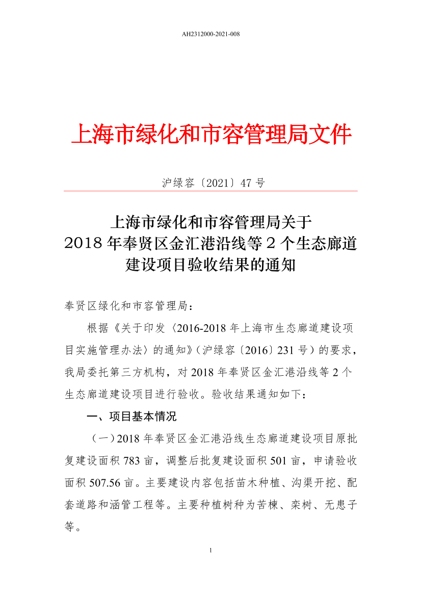 (一)2018年奉贤区金汇港沿线生态廊道建设项目原批复建设面积783亩,调整后批复建设面积501亩,申请验收面积507.56亩。主要建设内容包括苗木种植、沟渠开挖、配套道路和涵管工程等。主要种植树种为苦楝、栾树、无患子等。