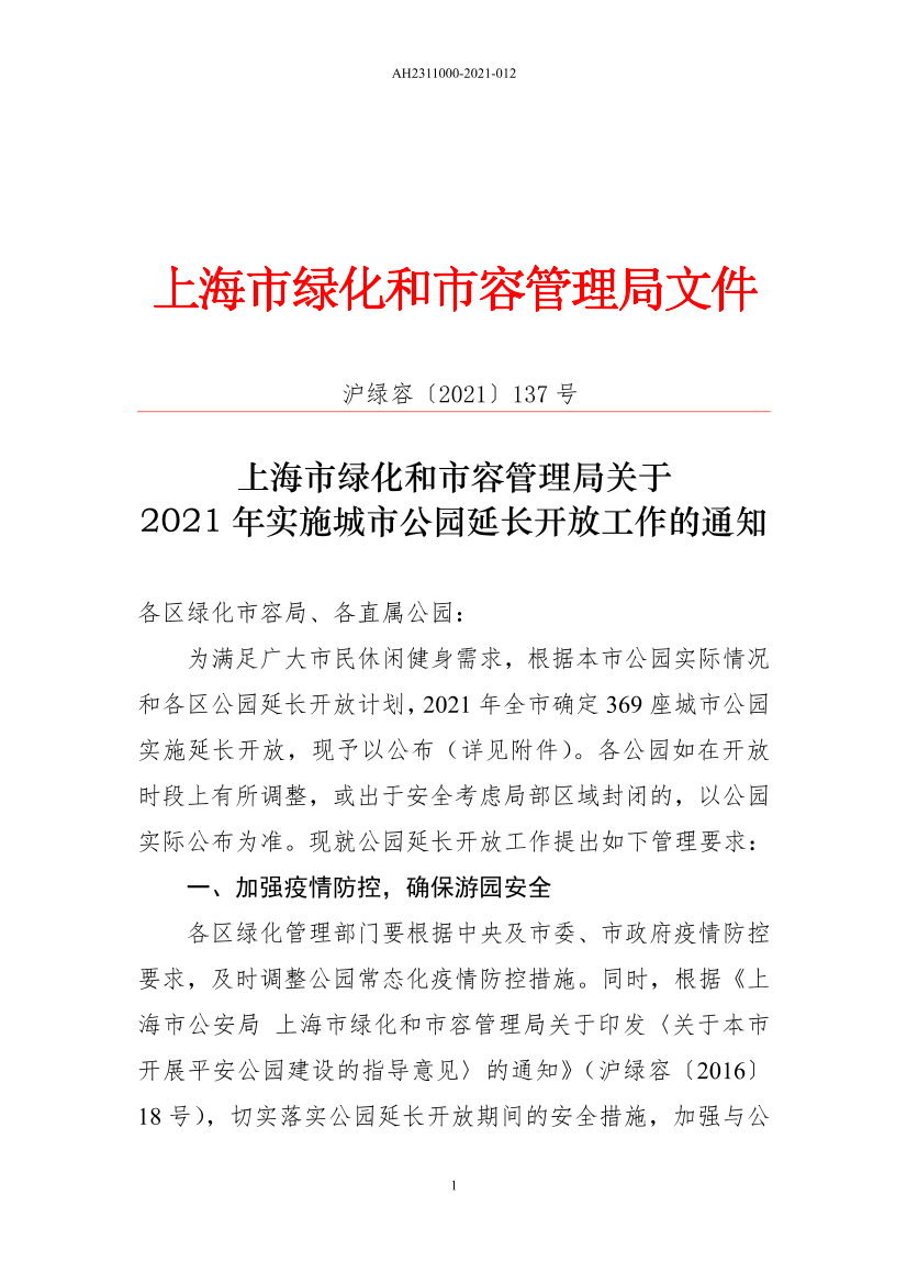 为满足广大市民休闲健身需求,根据本市公园实际情况和各区公园延长开放计划,2021年全市确定369座城市公园实施延长开放,现予以公布(详见附件)。各公园如在开放时段上有所调整,或出于安全考虑局部区域封闭的,以公园实际公布为准。现就公园延长开放工作提出如下管理要求: