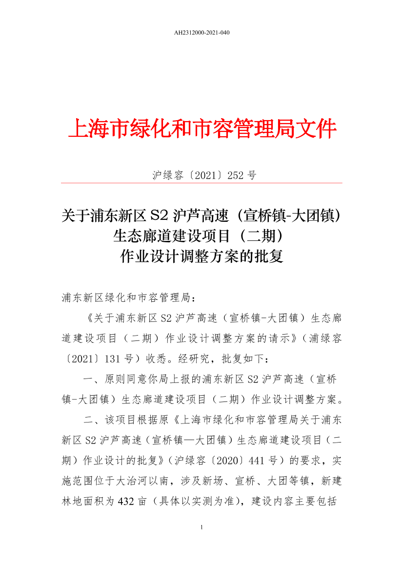 一、原则同意你局上报的浦东新区S2沪芦高速(宣桥镇-大团镇)生态廊道建设项目(二期)作业设计调整方案。