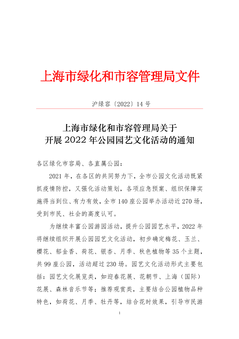 为继续丰富公园游园活动,提升公园园艺水平,2022年将继续组织开展公园园艺文化活动,初步确定梅花、玉兰、樱花、郁金香、荷花、银杏、月季、秋色植物等35个主题,共99座公园,活动超过230场。园艺文化活动形式主要包括:园艺文化展览类,如迎春花展、花朝节、上海(国际)花展、森林音乐节等;推荐观赏类,主要结合公园植物品种特色,如荷花、月季、牡丹等,结合花时效果,引导市民游览观赏。本活动同时也作为市民绿化节系列活动之一。