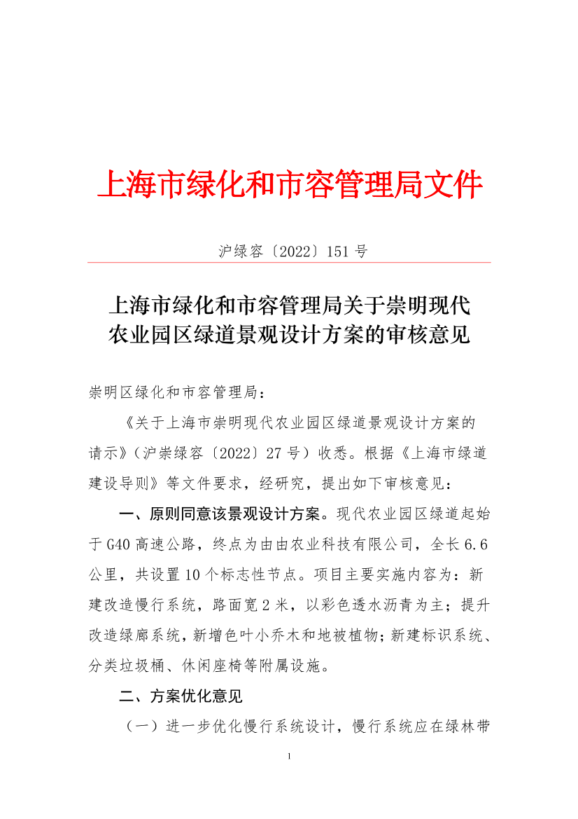 《关于上海市崇明现代农业园区绿道景观设计方案的请示》(沪崇绿容〔2022〕27号)收悉。根据《上海市绿道建设导则》等文件要求,经研究,提出如下审核意见:
