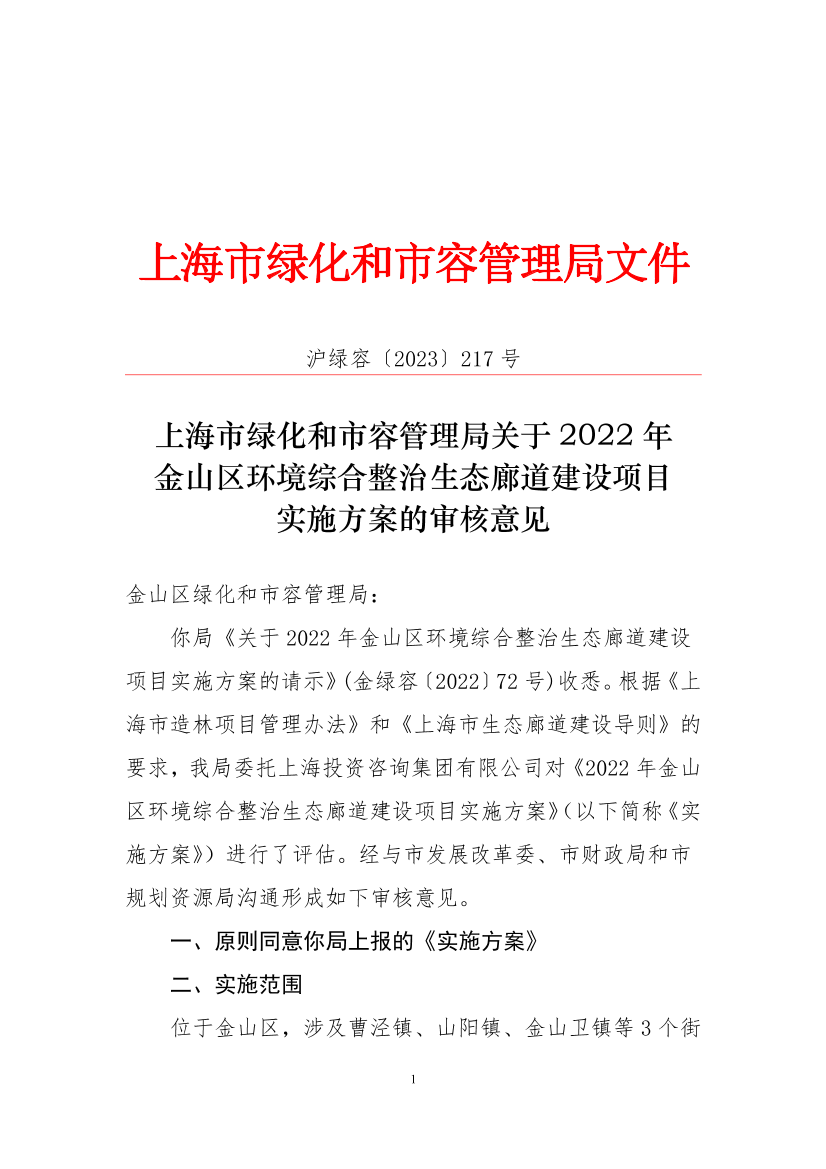 你局《关于2022年金山区环境综合整治生态廊道建设项目实施方案的请示》(金绿容〔2022〕72号)收悉。根据《上海市造林项目管理办法》和《上海市生态廊道建设导则》的要求,我局委托上海投资咨询集团有限公司对《2022年金山区环境综合整治生态廊道建设项目实施方案》(以下简称《实施方案》)进行了评估。经与市发展改革委、市财政局和市规划资源局沟通形成如下审核意见。