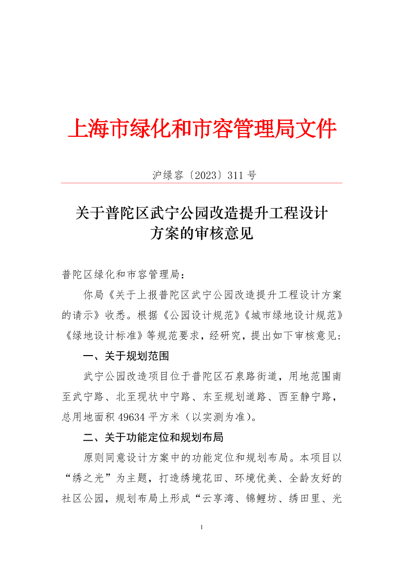 你局《关于上报普陀区武宁公园改造提升工程设计方案的请示》收悉。根据《公园设计规范》《城市绿地设计规范》《绿地设计标准》等规范要求,经研究,提出如下审核意见: