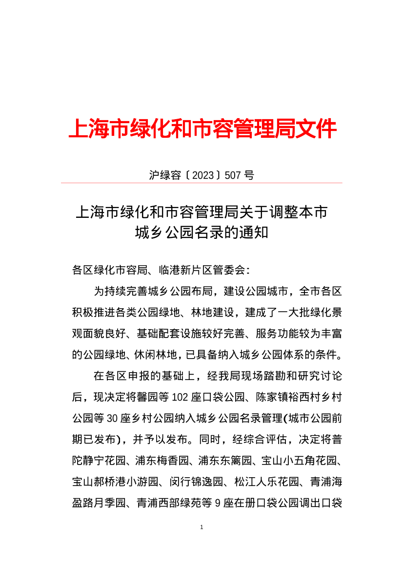 在各区申报的基础上,经我局现场踏勘和研究讨论后,现决定将馨园等 102座口袋公园、陈家镇裕西村乡村公园等 30座乡村公园纳入城乡公园名录管理(城市公园前期已发布),并予以发布。同时,经综合评估,决定将普陀静宁花园、浦东梅香园、浦东东篱园、宝山小五角花园、宝山郝桥港小游园、闵行锦逸园、松江人乐花园、青浦海盈路月季园、青浦西部绿苑等 9座在册口袋公园调出口袋公园名录。