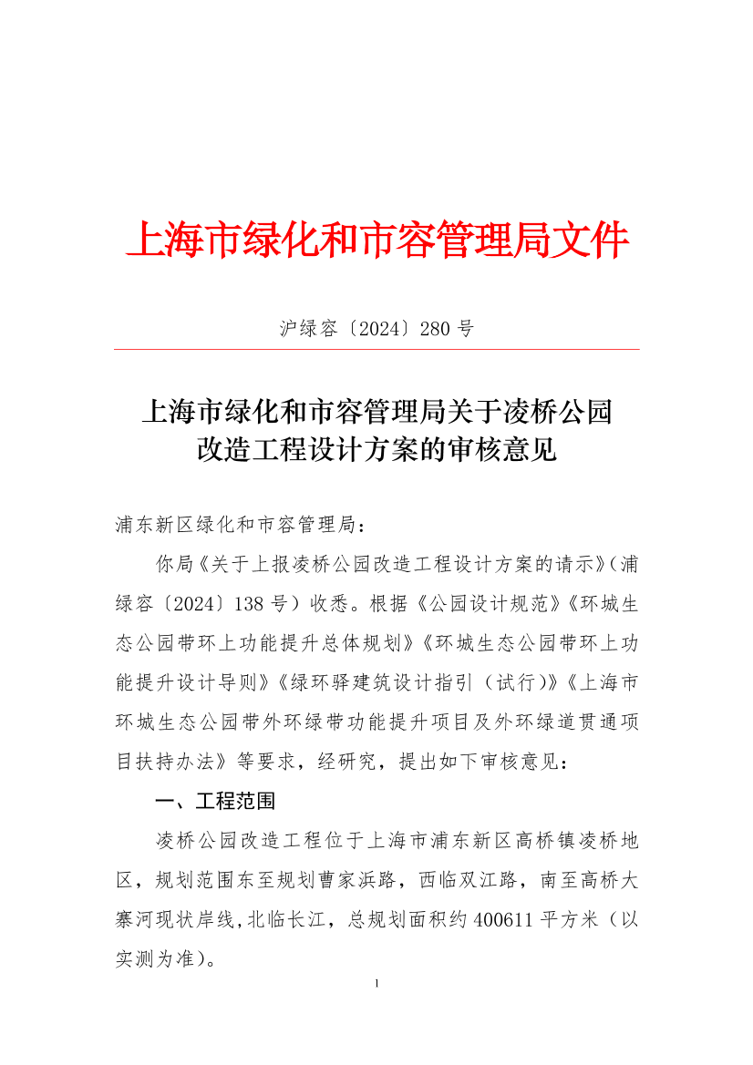 你局《关于上报凌桥公园改造工程设计方案的请示》(浦绿容〔2024〕138号)收悉。根据《公园设计规范》《环城生态公园带环上功能提升总体规划》《环城生态公园带环上功能提升设计导则》《绿环驿建筑设计指引(试行)》《上海市环城生态公园带外环绿带功能提升项目及外环绿道贯通项目扶持办法》等要求,经研究,提出如下审核意见: