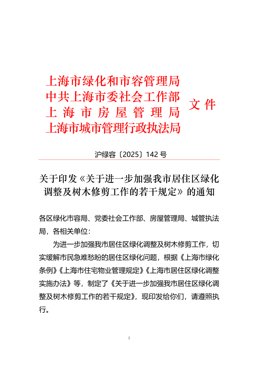 为进一步加强我市居住区绿化调整及树木修剪工作,切实缓解市民急难愁盼的居住区绿化问题,根据《上海市绿化条例》《上海市住宅物业管理规定》《上海市居住区绿化调整实施办法》等,制定了《关于进一步加强我市居住区绿化调整及树木修剪工作的若干规定》,现印发给你们,请遵照执行。