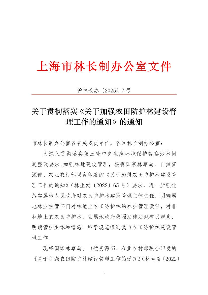 为深入贯彻落实第三轮中央生态环境保护督察涉林问题整改要求,加强林地建设管理,根据国家林草局、自然资源部、农业农村部联合印发的《关于加强农田防护林建设管理工作的通知》(林生发〔2022〕65号)要求,进一步强化落实属地人民政府对农田防护林建设管理主体责任,明确属地林业主管部门对林地上农田防护林的养护管理责任,对非林地上的农田防护林,由属地政府依照法律法规有关规定,明确管护主体和措施,科学规范推进我市农田防护林建设管理工作。