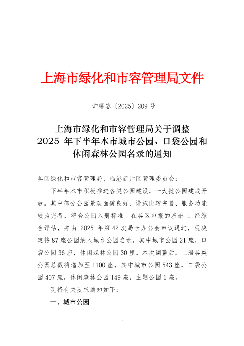 下半年本市积极推进各类公园建设,一大批公园建成开放。其中部分公园景观面貌良好、设施比较完善、服务功能较为完备,符合公园入册标准。在各区申报的基础上,经综合评估,并由 2025 年第42次局长办公会审议通过,现决定将87座公园纳入城乡公园名录,其中城市公园21座,口袋公园36座,休闲森林公园30座。本次调整后,上海各类公园总数将增加至1100座,其中城市公园543座,口袋公园407座,休闲森林公园149座,主题公园1座。
