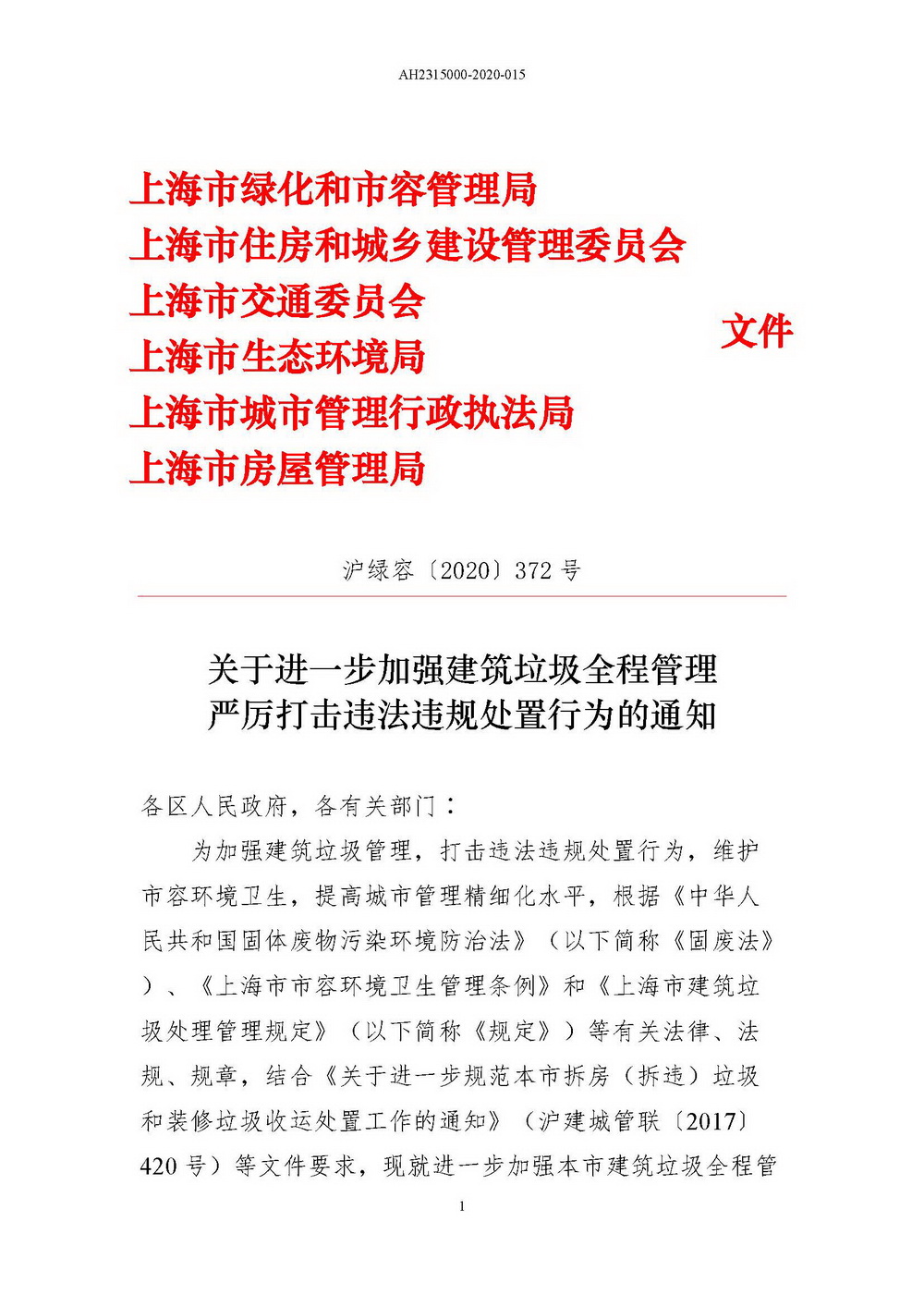 为加强建筑垃圾管理,打击违法违规处置行为,维护市容环境卫生,提高城市管理精细化水平,根据《中华人民共和国固体废物污染环境防治法》(以下简称《固废法》)、《上海市市容环境卫生管理条例》和《上海市建筑垃圾处理管理规定》(以下简称《规定》)等有关法律、法规、规章,结合《关于进一步规范本市拆房(拆违)垃圾和装修垃圾收运处置工作的通知》(沪建城管联〔2017〕420号)等文件要求,现就进一步加强本市建筑垃圾全程管理的有关要求通知如下: