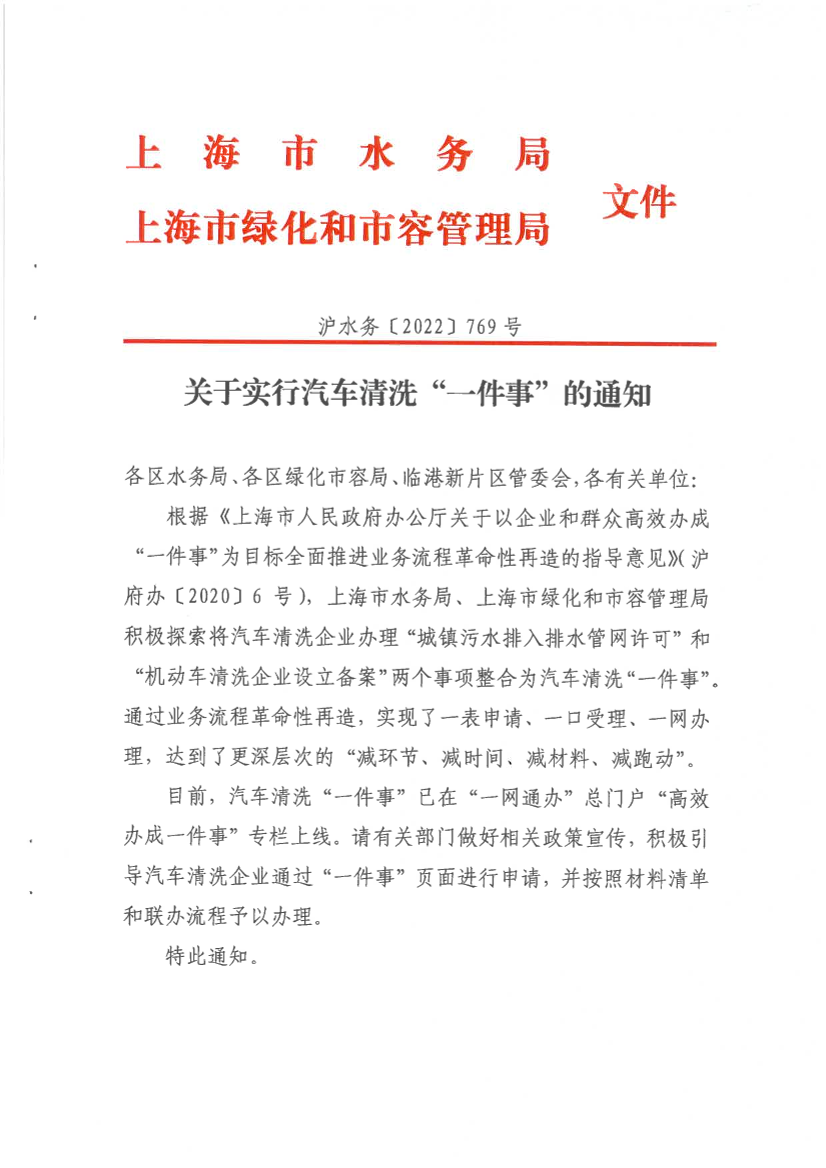 根据《上海市人民政府办公厅关于以企业和群众高效办成“一件事”为目标全面推进业务流程革命性再造的指导意见》(沪府办 (2020) 6 号), 上海市水务局、 上海市绿化和市容管理局积极探索将汽车清洗企业办理 “城镇污水排入排水管网许可” 和机动车清洗企业设立备案” 两个事项整合为汽车清洗”一件事” 。通过业务流程革命性再造,实现了 一表申请、 一 口受理、 一网办理, 达到了更深层次的 "减环节、 减时间、 减材料、 减跑动” 。