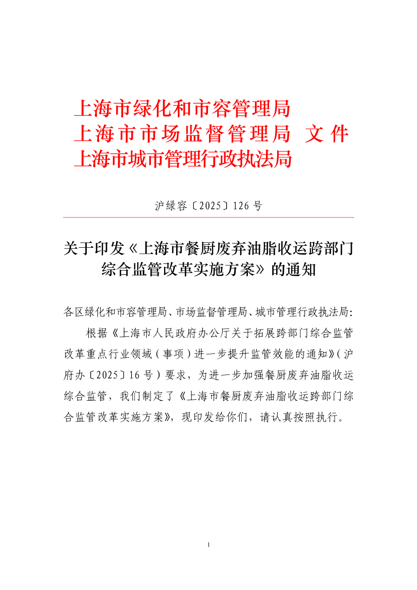 根据《上海市人民政府办公厅关于拓展跨部门综合监管改革重点行业领域(事项)进一步提升监管效能的通知》(沪府办〔2025〕16 号)要求,为进一步加强餐厨废弃油脂收运综合监管,我们制定了《上海市餐厨废弃油脂收运跨部门综合监管改革实施方案》,现印发给你们,请认真按照执行。