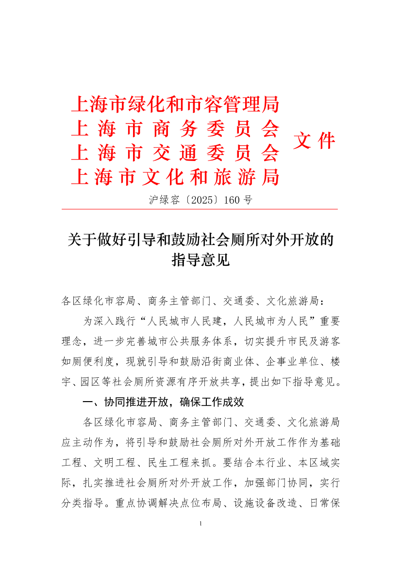 为深入践行“人民城市人民建,人民城市为人民”重要理念,进一步完善城市公共服务体系,切实提升市民及游客如厕便利度,现就引导和鼓励沿街商业体、企事业单位、楼宇、园区等社会厕所资源有序开放共享,提出如下指导意见。