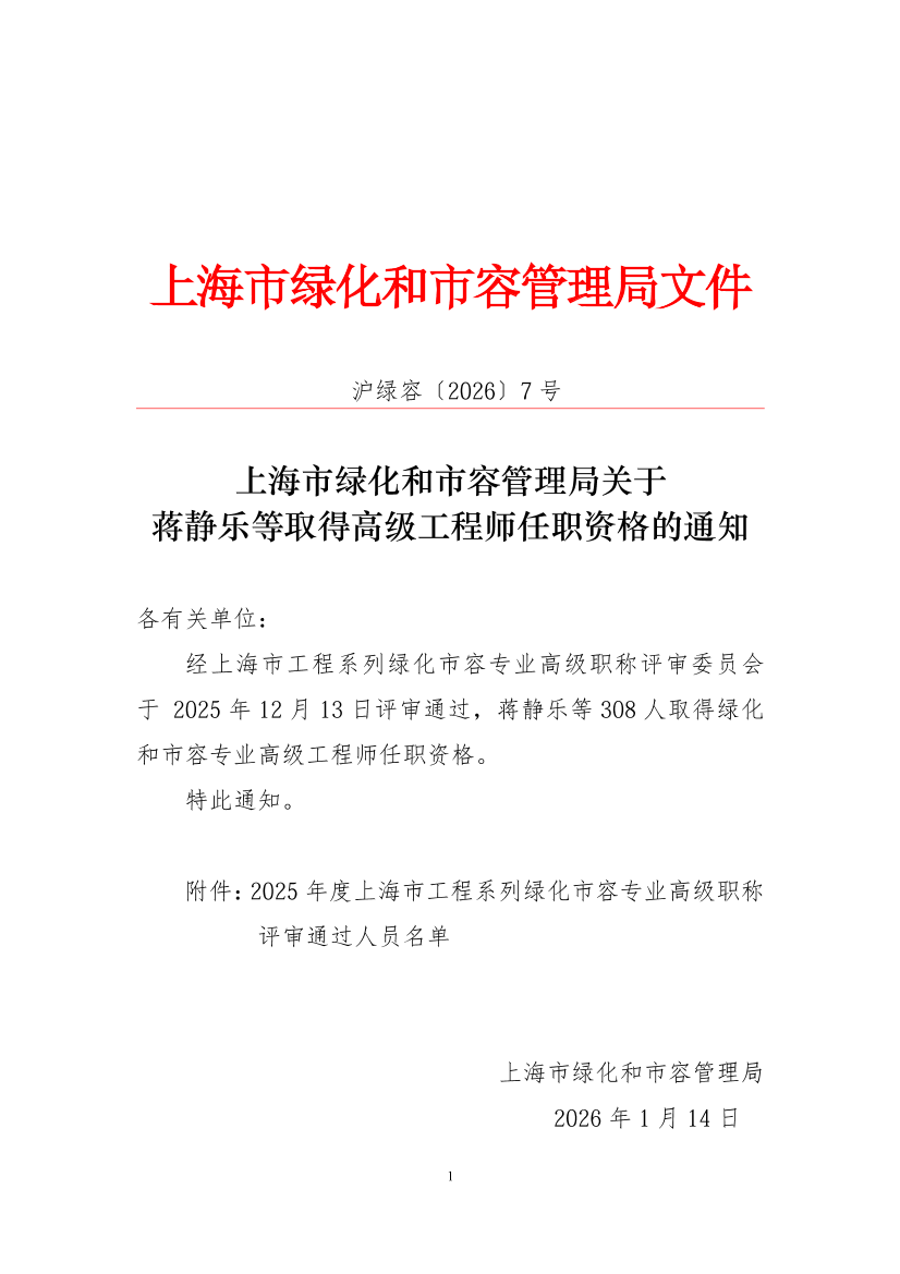 经上海市工程系列绿化市容专业高级职称评审委员会于 2025年12月13日评审通过,蒋静乐等308人取得绿化和市容专业高级工程师任职资格。