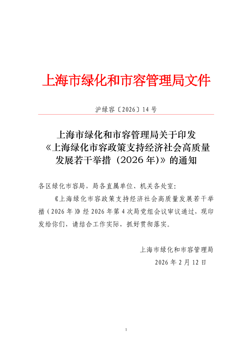 《上海绿化市容政策支持经济社会高质量发展若干举措(2026年)》经2026年第4次局党组会议审议通过,现印发给你们,请结合工作实际,抓好贯彻落实。