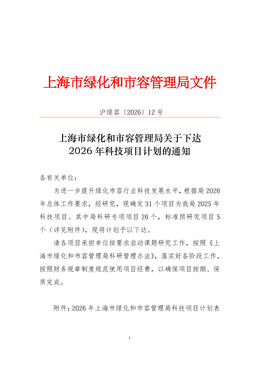 为进一步提升绿化市容行业科技发展水平,根据局2026年总体工作要求,经研究,现确定31个项目为我局2025年科技项目。其中局科研专项项目26个,标准预研究项目5个(详见附件),现将计划予以下达。