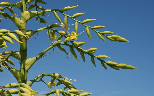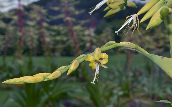 卷瓣凤梨宽大的莲座状叶丛中央伸出绿色或红色的圆锥状花序,叶丛直径约1.2米,株高大多在1.8米至2.2米之间,如一株株小树一般;随着花序上花枝的伸长,一朵朵黄色、金黄色或粉白色的花朵渐次开放,颜色因种而异;花瓣不同程度地向后卷曲,同时散发着阵阵的花香,也引来了蜜蜂纷纷前来采蜜。