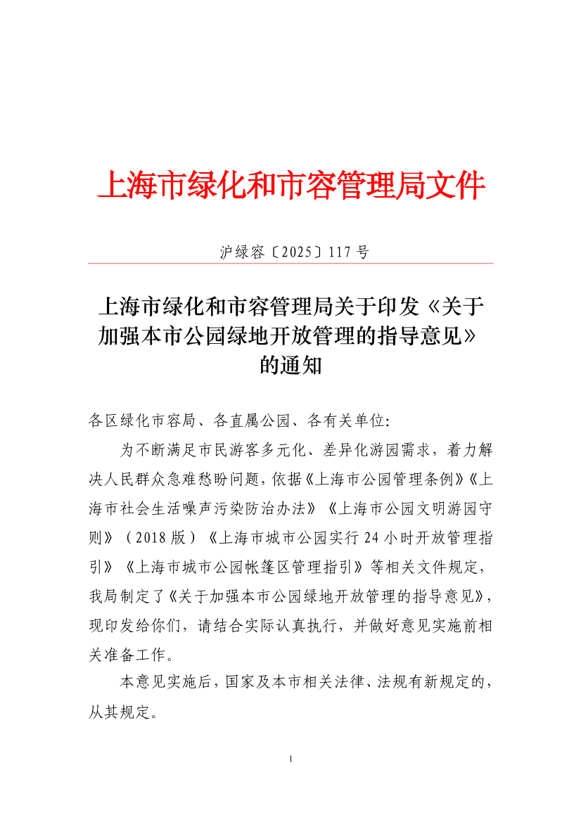 为不断满足市民游客多元化、差异化游园需求,着力解决人民群众急难愁盼问题,依据《上海市公园管理条例》《上海市社会生活噪声污染防治办法》《上海市公园文明游园守则》(2018 版)《上海市城市公园实行 24 小时开放管理指引》《上海市城市公园帐篷区管理指引》等相关文件规定,我局制定了《关于加强本市公园绿地开放管理的指导意见》,现印发给你们,请结合实际认真执行,并做好意见实施前相关准备工作。