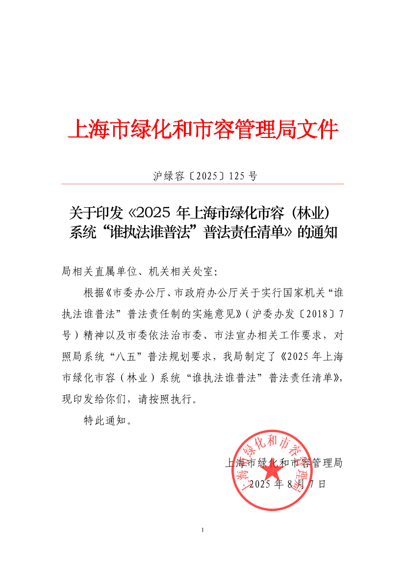 号)精神以及市委依法治市委、市法宣办相关工作要求,对照局系统“八五”普法规划要求,我局制定了《2025 年上海市绿化市容(林业)系统“谁执法谁普法”普法责任清单》,现印发给你们,请按照执行。