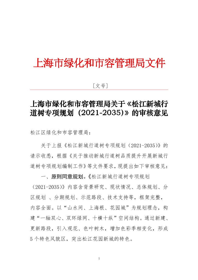 关于上报《松江新城行道树专项规划(2021-2035)》的请示收悉,根据《关于推动新城行道树品质提升开展新城行道树专项规划编制工作》等文件要求,现提出如下审核意见: